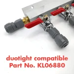 CO2 jakotukki 2 lähdölle. Jakotukissa on MFL-kierre ja siihen käy suoraan Duotight 8 mm ja Duotight 9.5 mm sovittimet. Jakotukit on suunniteltu kestämään jopa 100 psi. HUOM: Jakotukit ovat vain kaasulle. Huomaa, että jakotukin takaiskuventtiilimekanismin vuoksi painehävikki on noin 2 psi. Aseta siis haluttu paine 2 psi korkeammalle, kuin normaalisti!